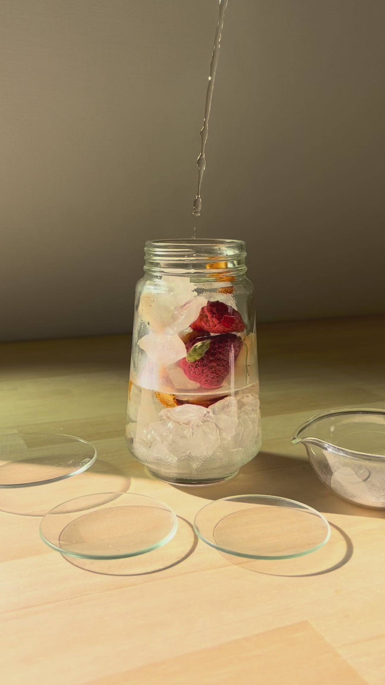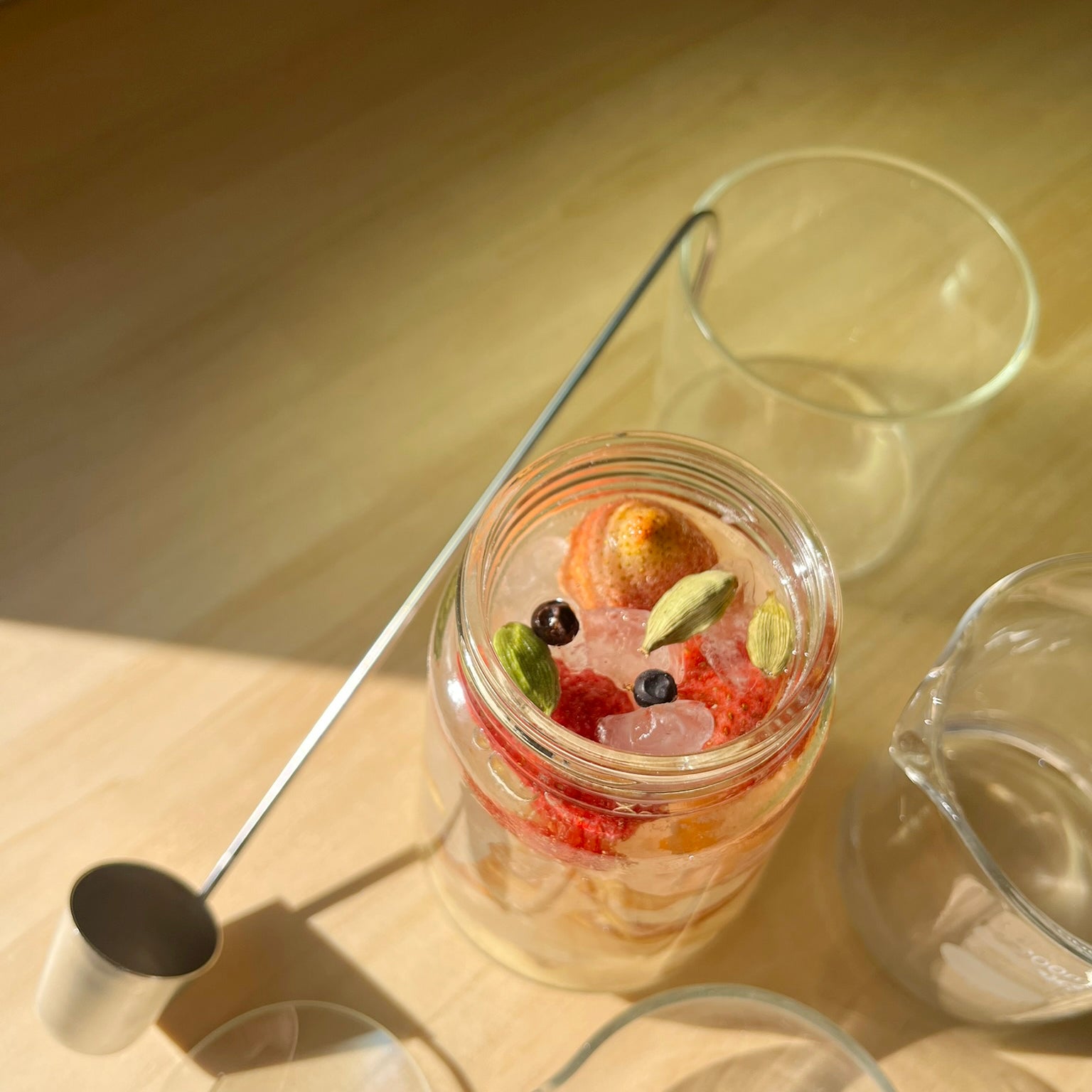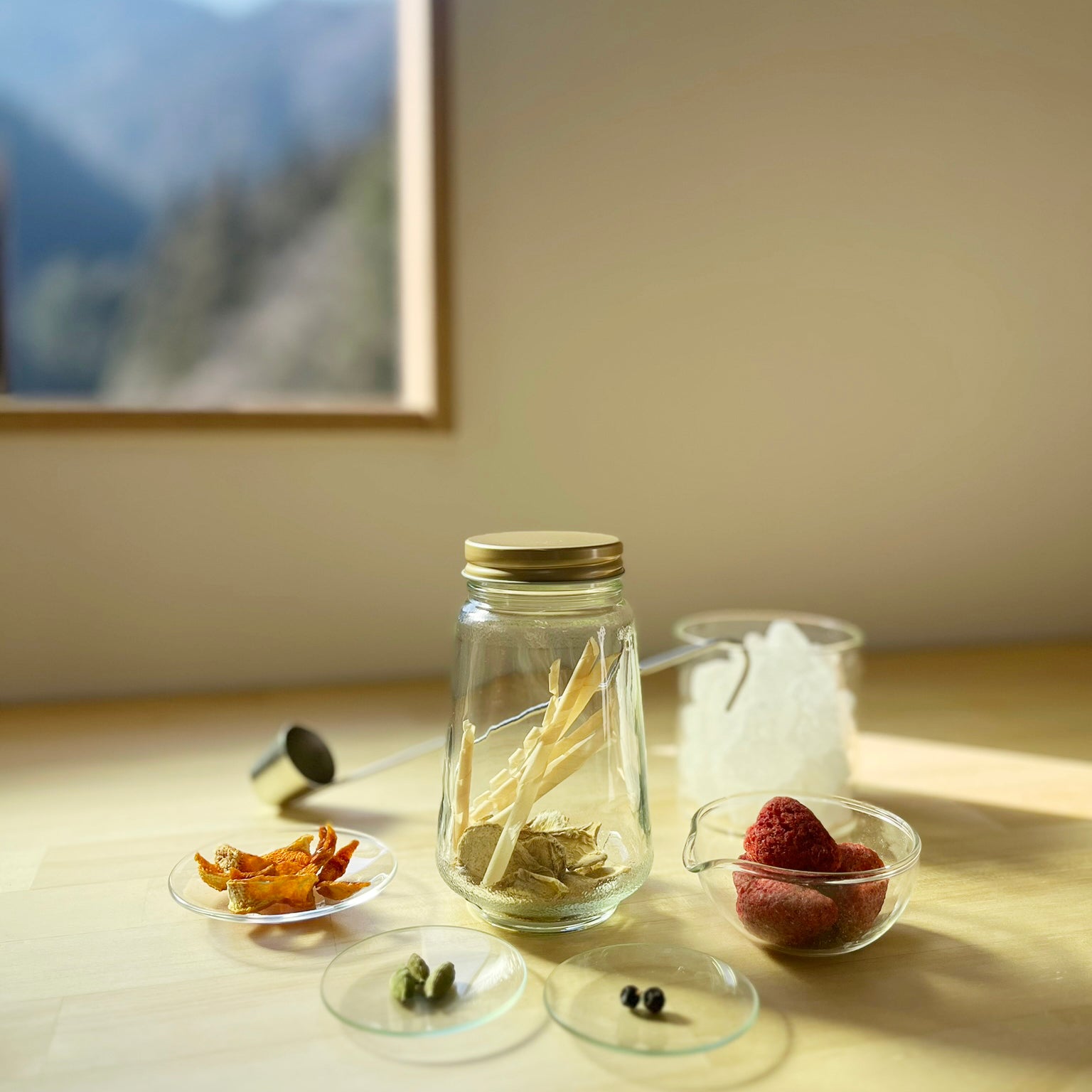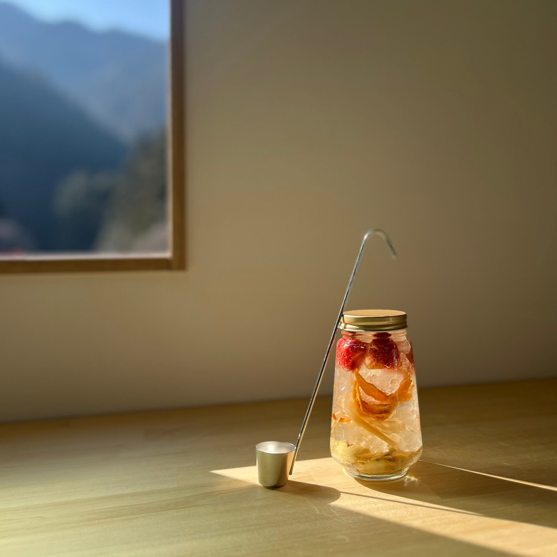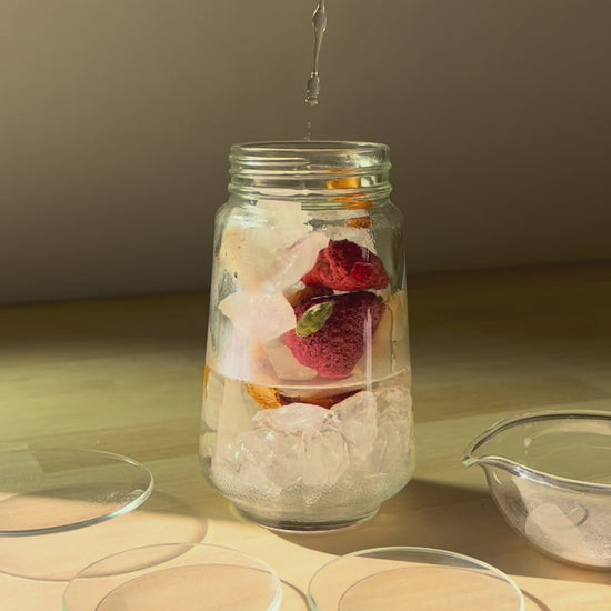 煮詰めない。急がない。氷砂糖がゆっくりと溶け、ドライイチゴの赤とヒノキの香りが混じり合うのを待つ数日間。瓶の中で森が溶け出すプロセスそのものが、あなたを慈しむ時間になります。